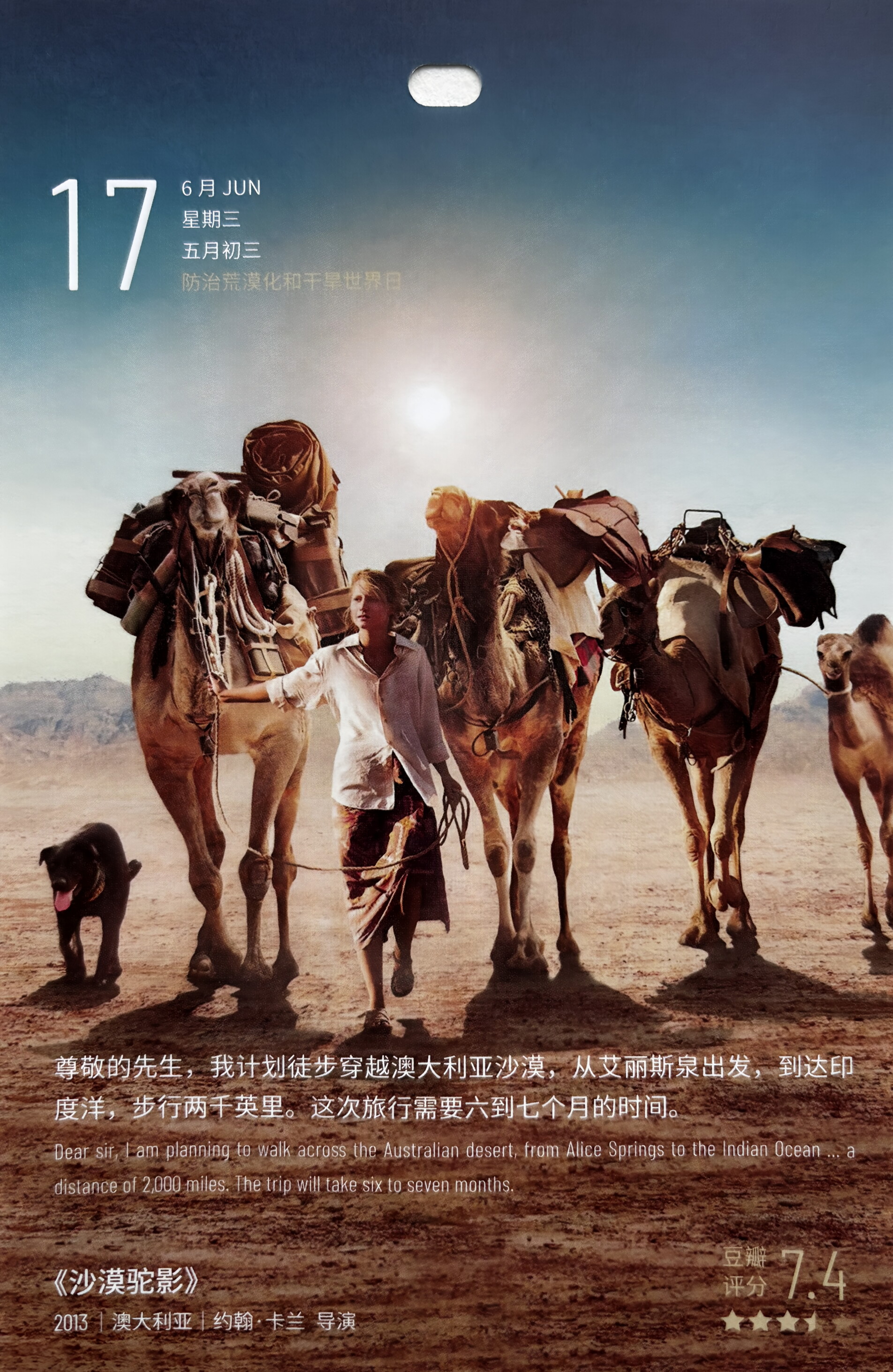 影片根据Robyn Davidson所著自传体畅销书《轨迹》改编,讲述了一名女子实现渴望已久的追逐荒野大漠的梦想,独自一人在四只骆驼和一条忠诚的狗的陪伴下穿越澳大利亚沙漠的故事。她从悉尼出发到艾丽斯斯普林斯,独自展开一场横越澳洲的千里沙漠之行,最后抵达澳