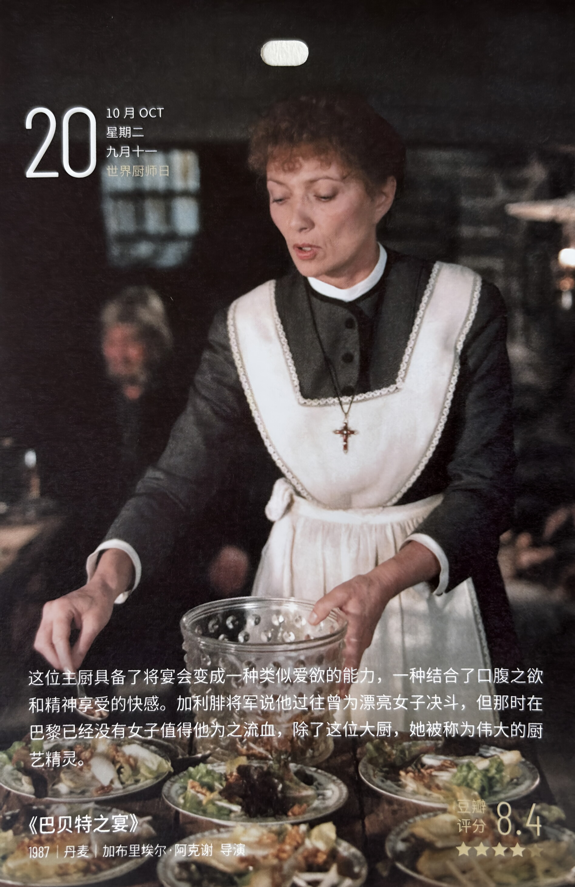 村里来了一个身世神秘的巴黎女子芭比特,愿意无偿为她们当厨师。原来她是逃亡的难民,之前是法国餐厅的名厨;后来她中了彩票,竟然用所有的积蓄为村民做了一桌正宗丰盛的法国