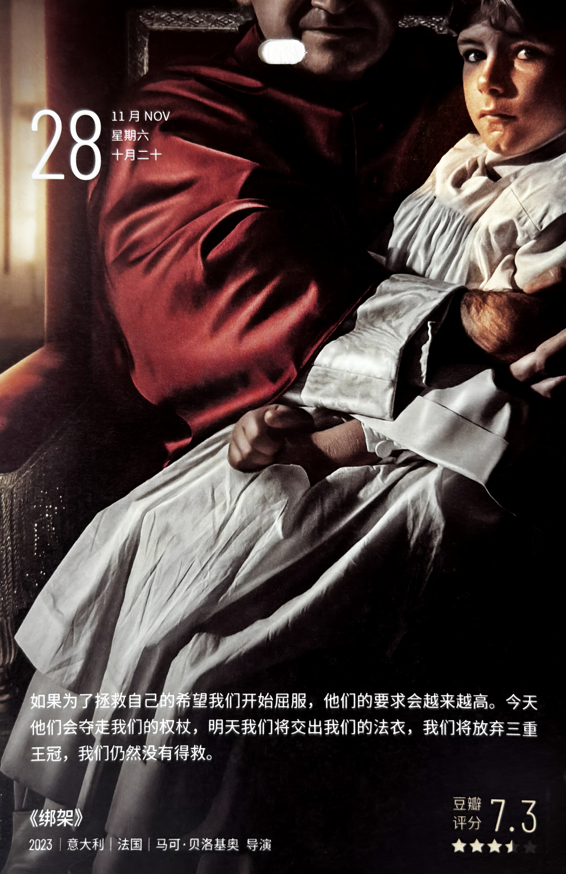 1858年,在博洛尼亚的犹太区,教皇的士兵闯入了莫塔拉家,按照枢机主教的命令,他们要抢走莫塔拉家的七岁儿子埃德加罗。这个孩子在婴儿时期被保姆秘密洗礼,教皇法律是不容置疑的:他必须接受天主教教育。莫塔拉的父母心痛万分,他们将不惜一切代价取回自